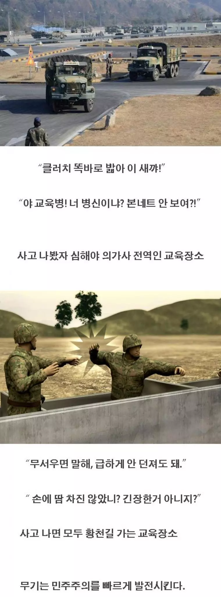 4가지 없는 쪽바리 군대 습성을 배운탓에 훈련병이건 아랫사람에건 굴리고 보는 한국군과 달리 언제든 총을 쏠 수 있는...미국은 총앞에서 예절바른 태도를 보임.
