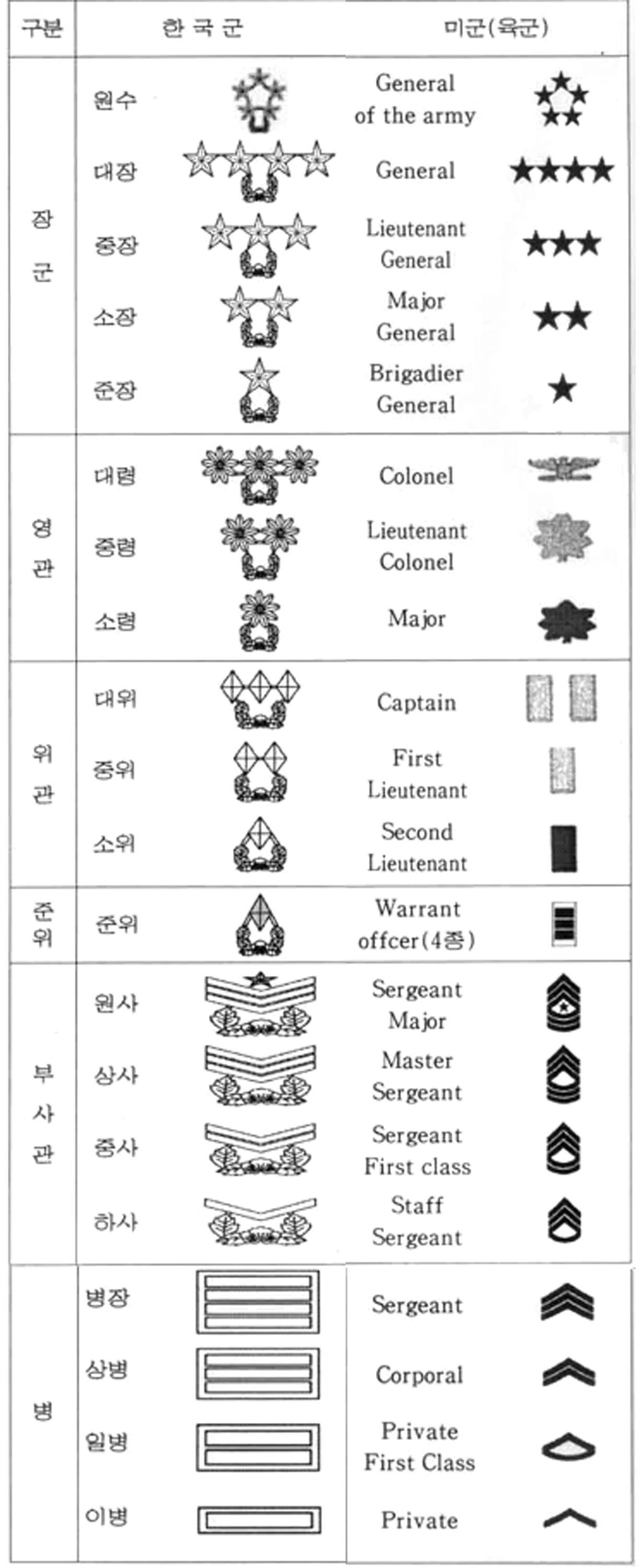 - 위관급(Company Grade Officer): 소위(Second Lieutenant, 2LT), 중위(First Lieutenant, 1LT), 대위(Captain, CPT)