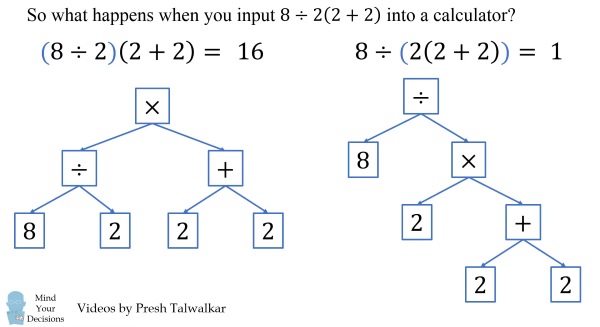 사칙연산 규칙 6÷2(1+2)의 답은 9일까 1일까? 정답은 "9", 8 ÷ 2(2 + 2)는?