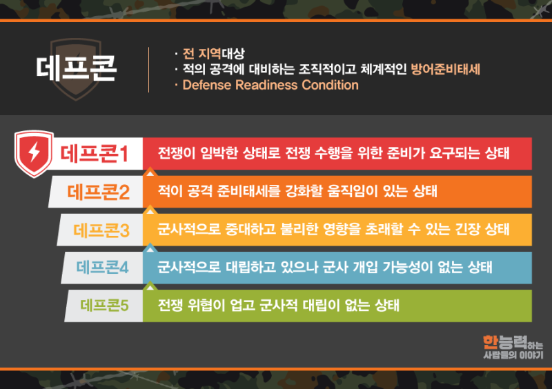 - 4단계: 경계 강화 상태입니다. 한국전쟁 이후 한국은 평상시 4단계를 유지하고 있습니다.