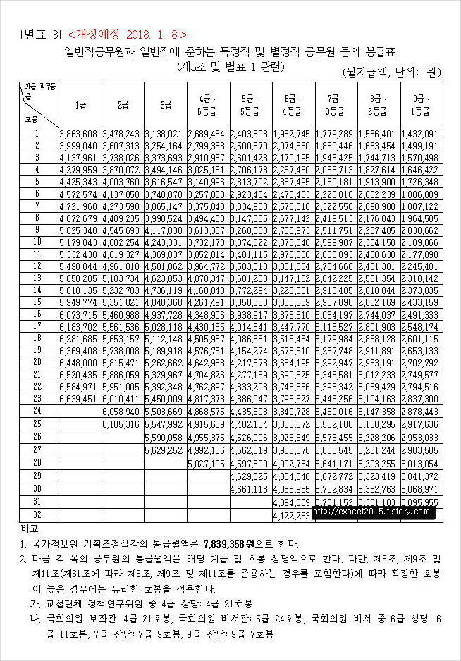 2018 일반직 공무원 봉급표