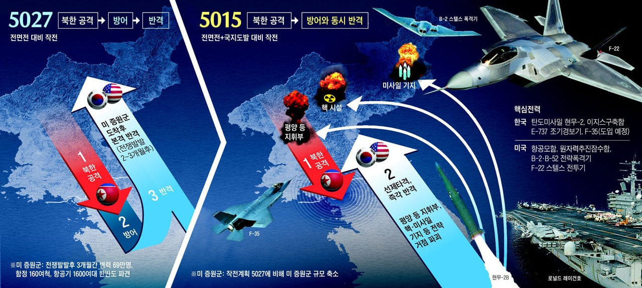 - 기존 작계 5027: 북한의 남침 → 방어선 유지 → 미군 증원 후 반격.