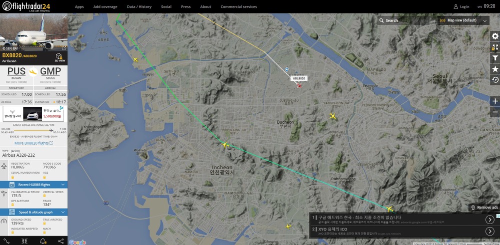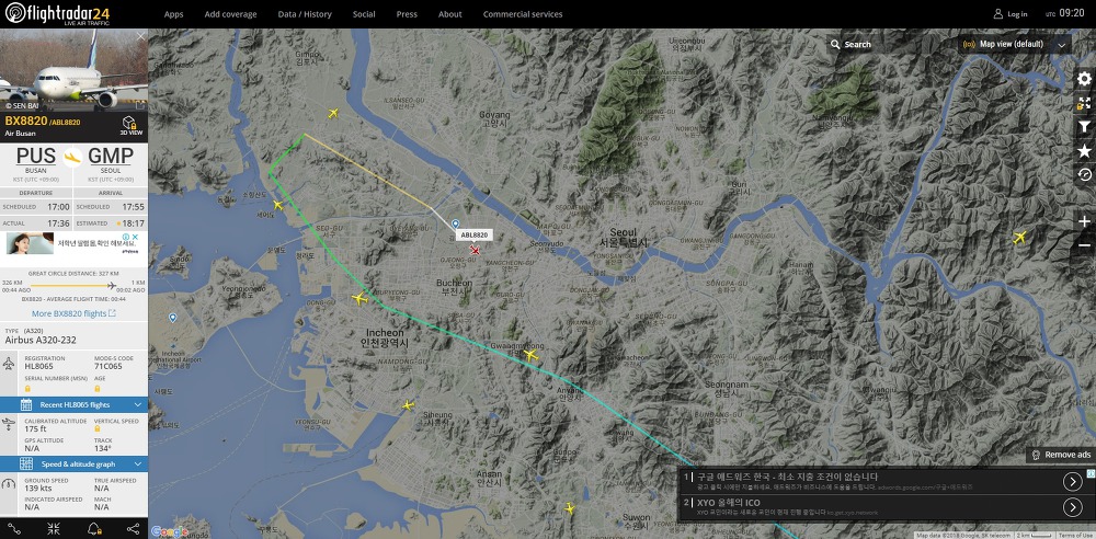 집 근처에 김포공항이 있어서 스마트폰으로 실시간 비행기 추적 앱인 플라이트 레이더 어플을 보곤 합니다.