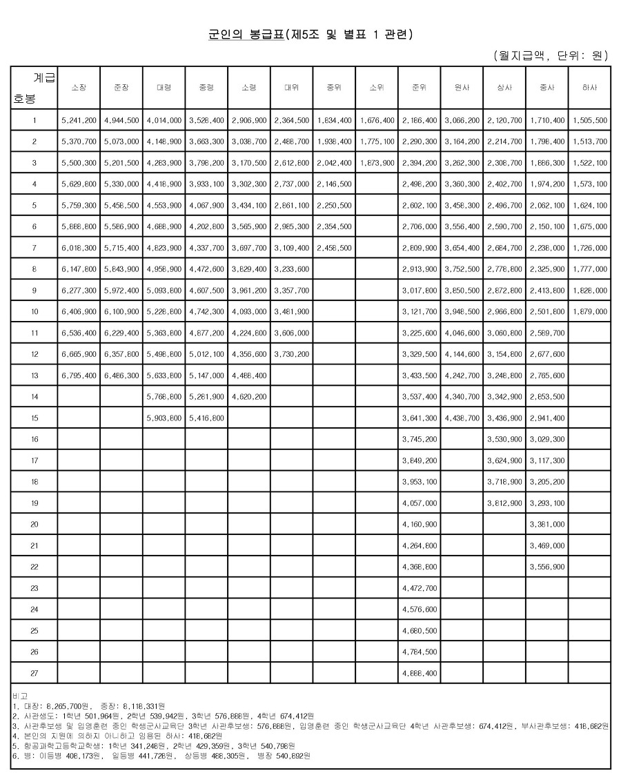군인 월급 봉급표