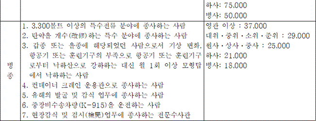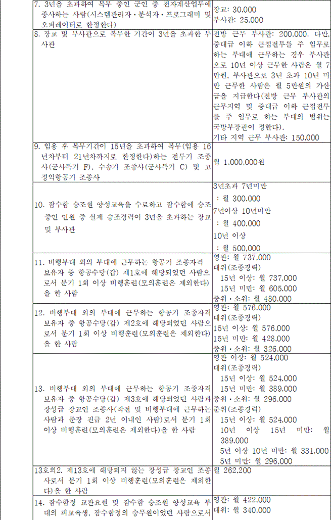 해군에도 헬기 조종사들이 있으며, 이들 역시 항공 수당을 받습니다. 헬기를 조종하는 해군 준위들은 그 위험도 때문에 수당이 상당히 높은 편입니다. 물론 전투함이나 전투정 승무원들에게도 특수근무 수당이 지급되어, 그들의 헌신적인 노력을 보상합니다.
