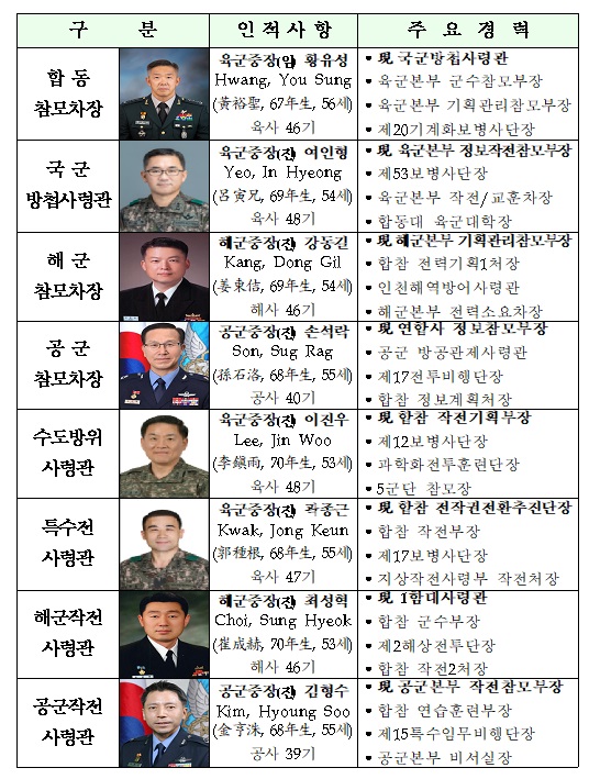- 합동참모차장: 황유성 국군방첩사령관 (중장·육사 46기)는 국군방첩사령관으로부터 합동참모차장으로 보직이 이동되었습니다.