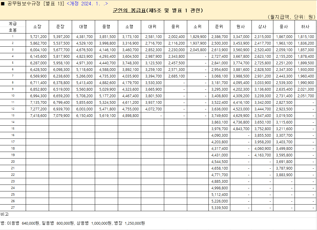 2024년 군인 봉급표: 계급별 월지급액 예상