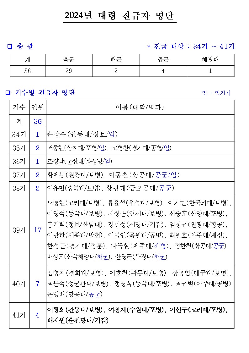 이번에 발표된 2025년 대령 진급자 명단은 ROTC 출신들이 다양한 병과에서 활약하고 있음을 보여줍니다. 기수별로 나누어보면, 총 36명이 육군, 해군, 공군, 해병대에서 대령으로 진급되었습니다.